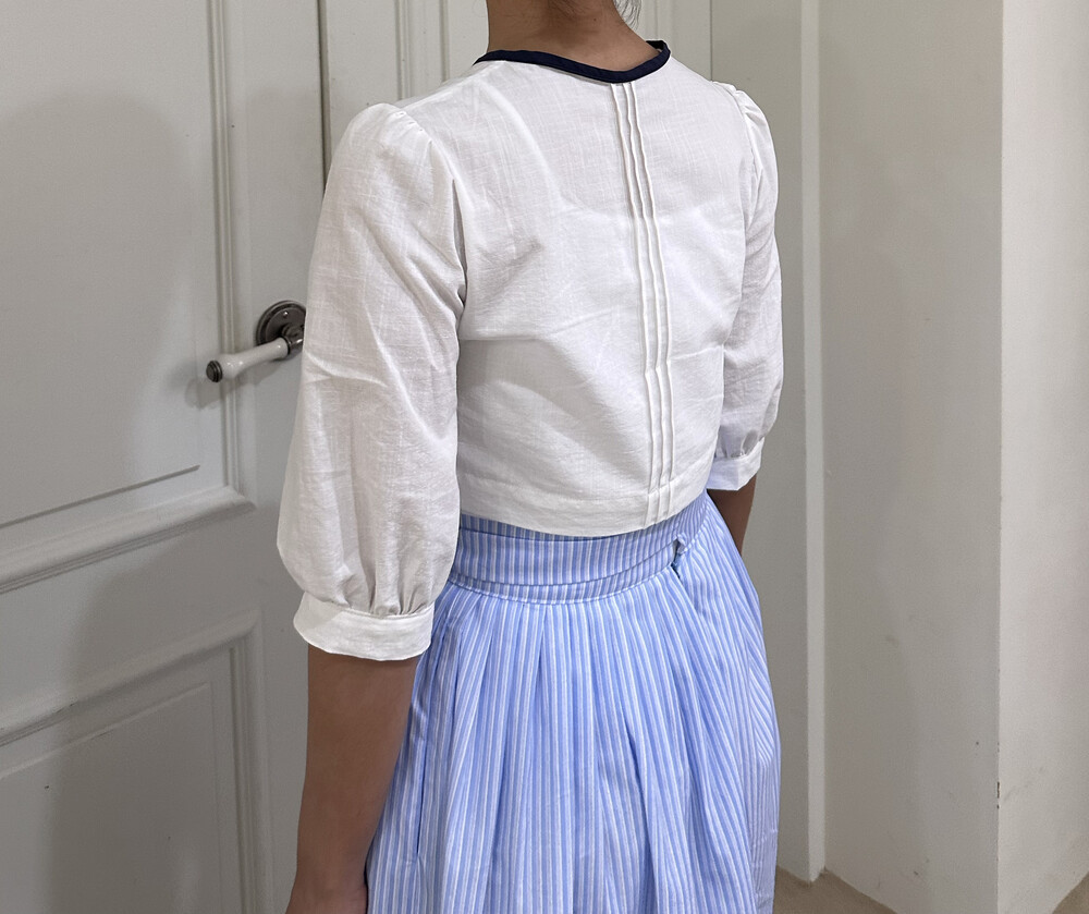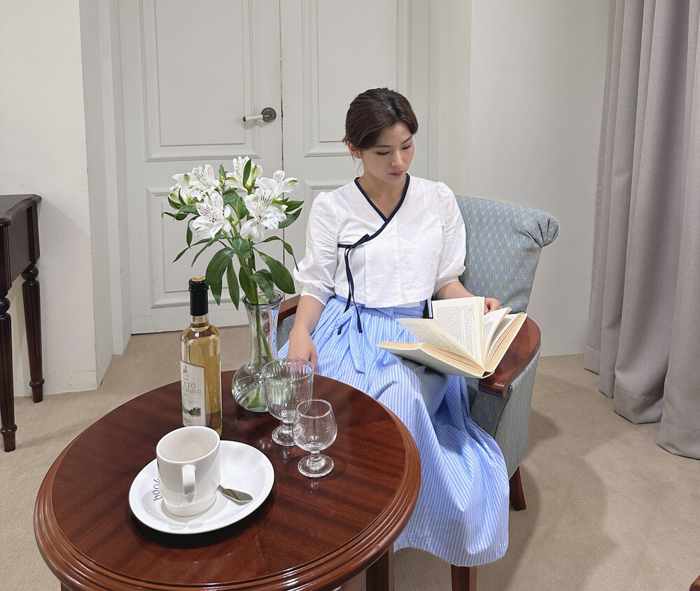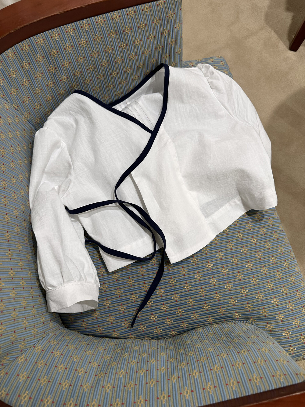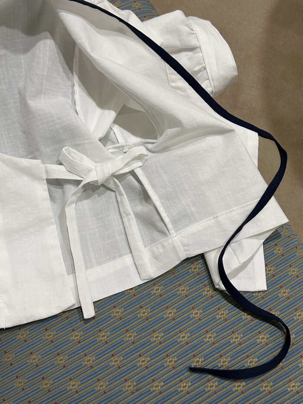 네크라인에서 내려오는 바이어스 리본이 고름역할을 하는 저고리입니다.