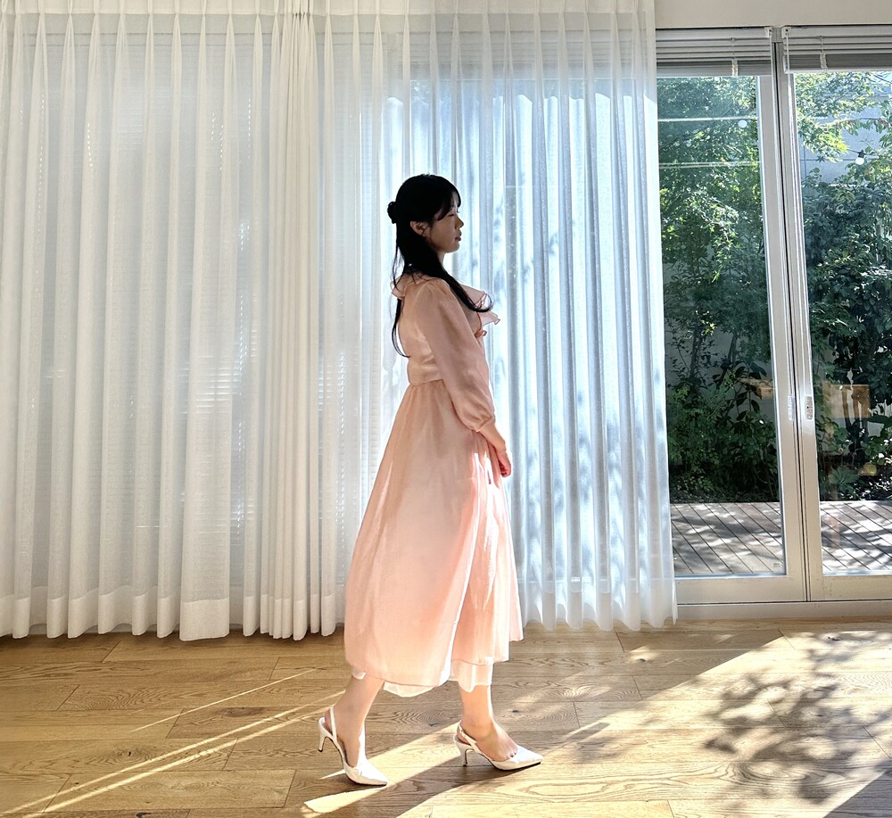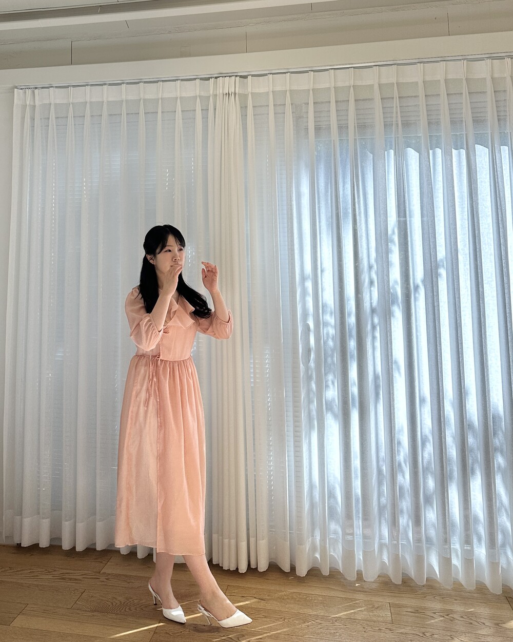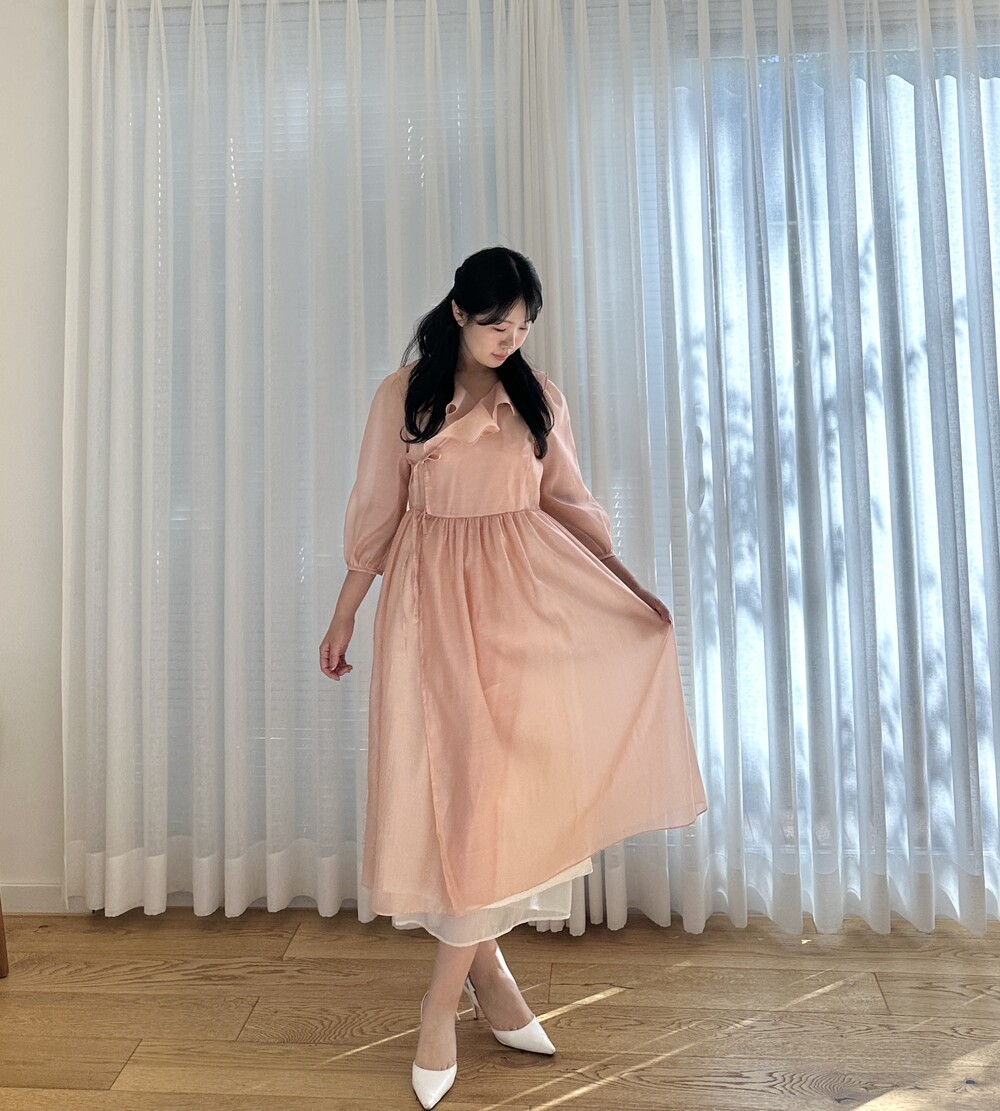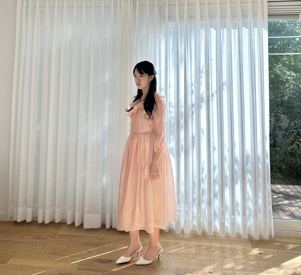 모델 착용 s 사이즈 - 원피스 속에 민소매 니트, 롱스커트 착용