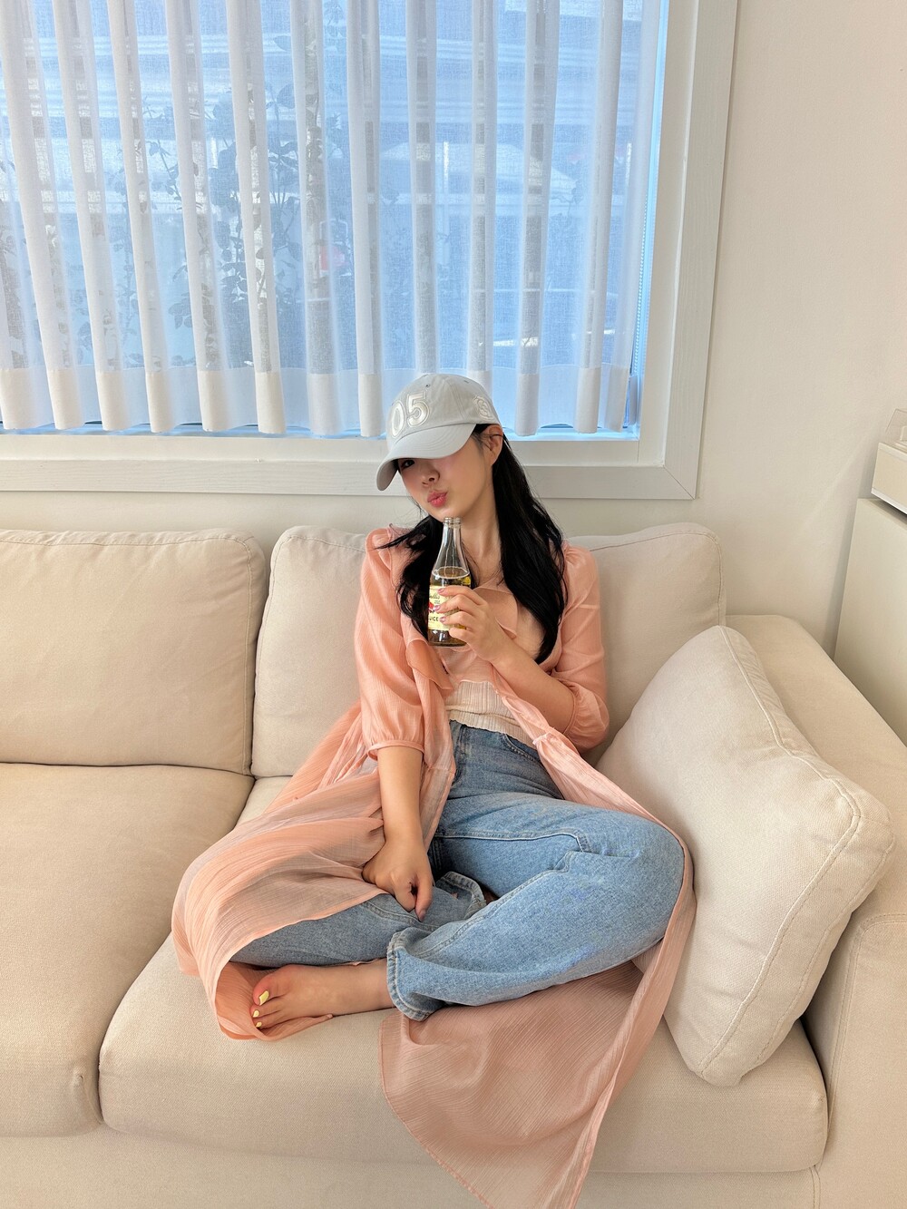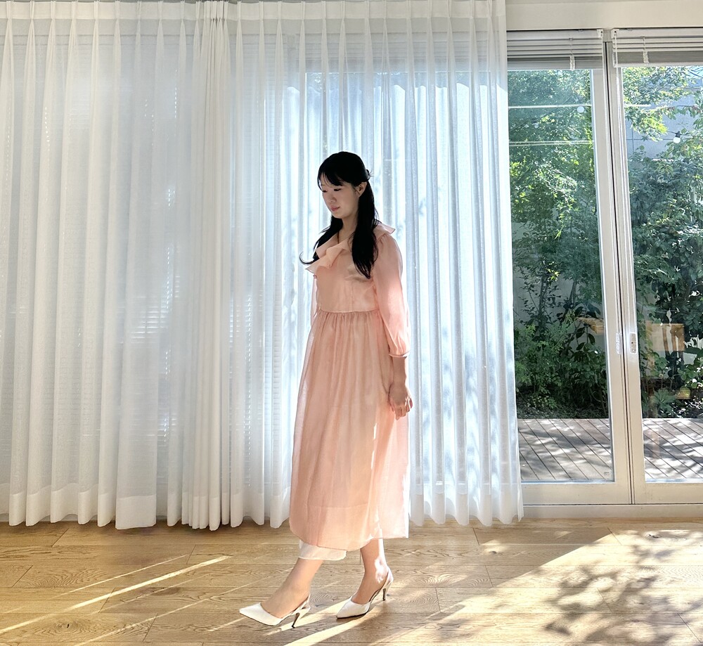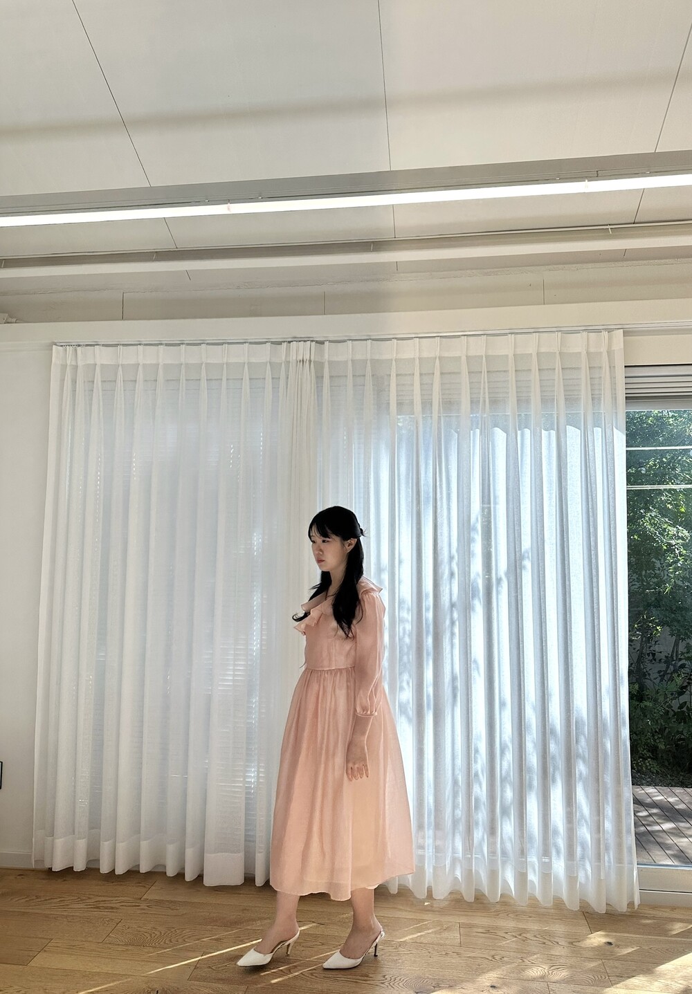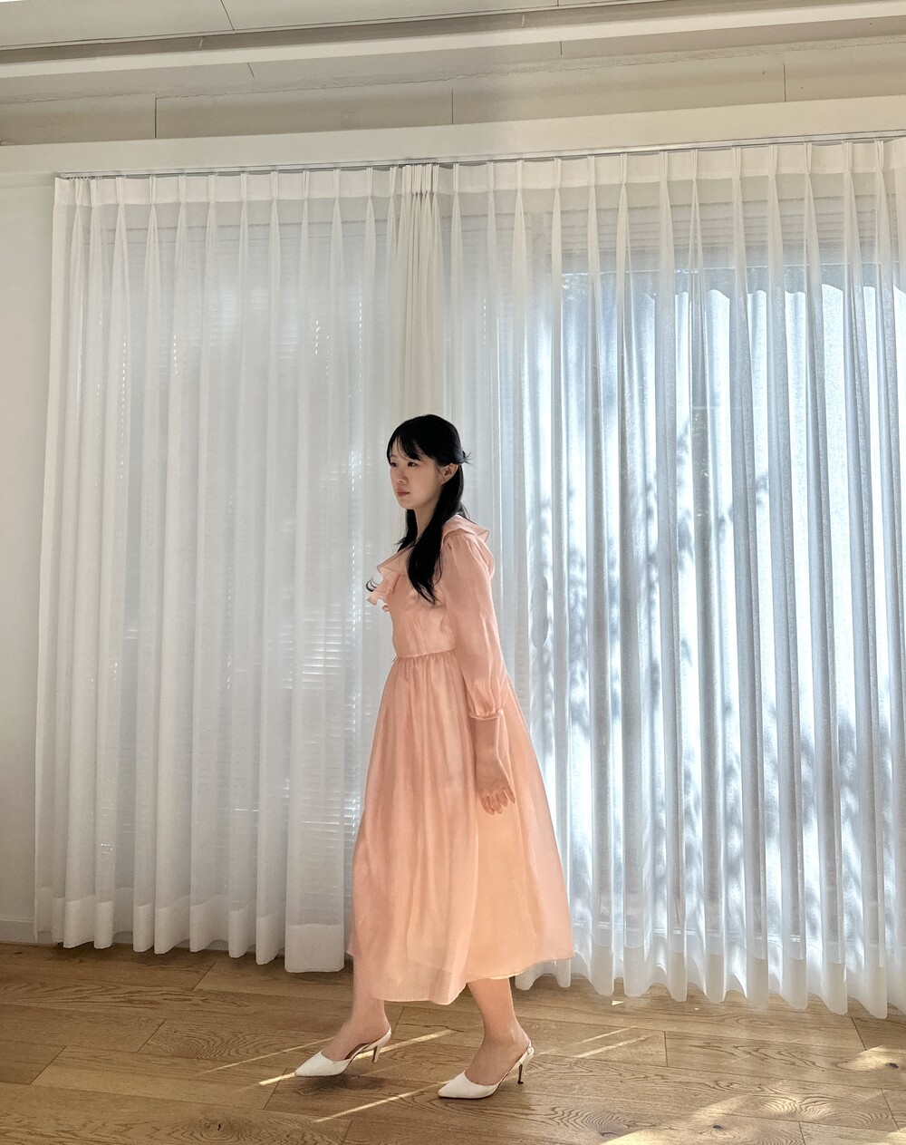 모델 착용 s 사이즈 - 원피스 속에 민소매 니트, 롱스커트 착용