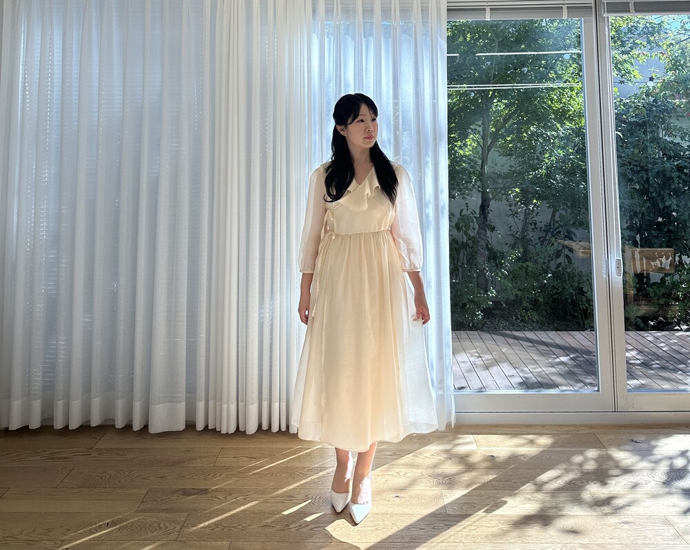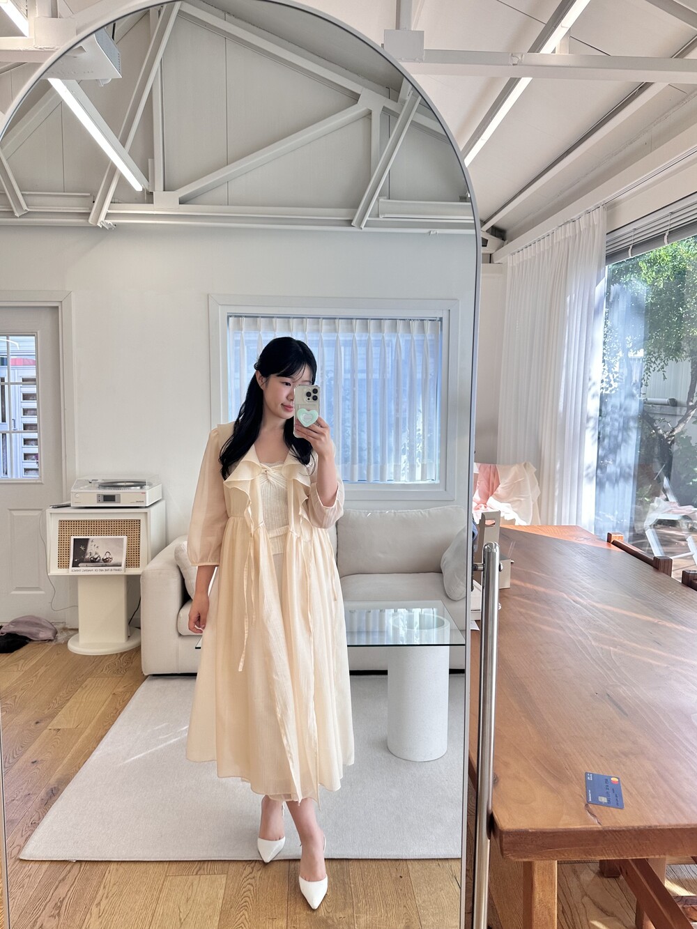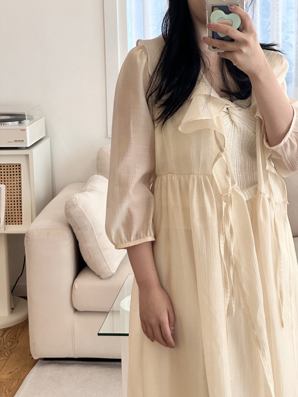모델 착용 s 사이즈 - 원피스 속에 민소매 니트, 롱스커트 착용