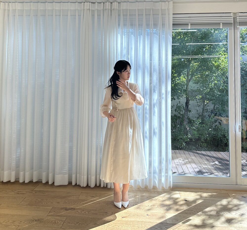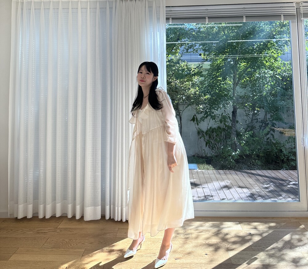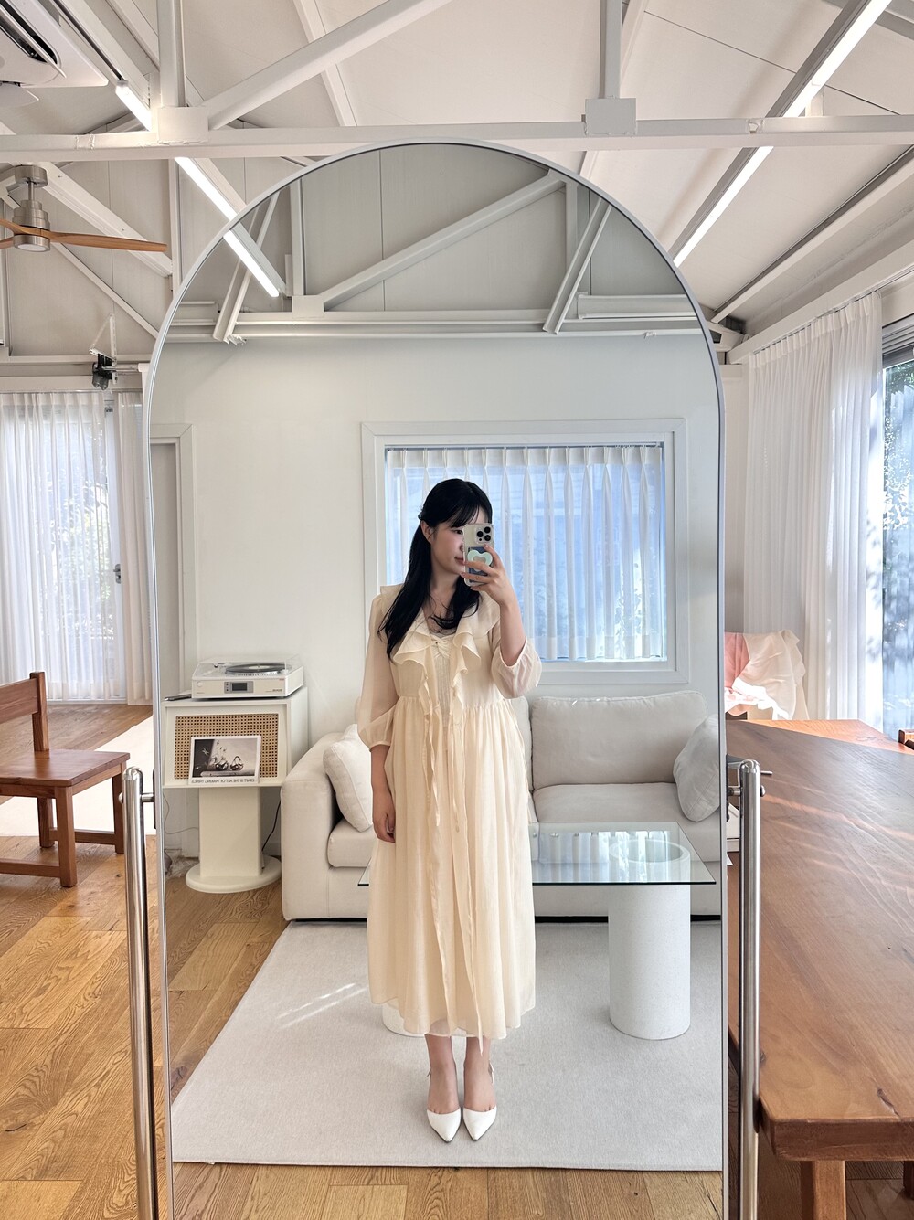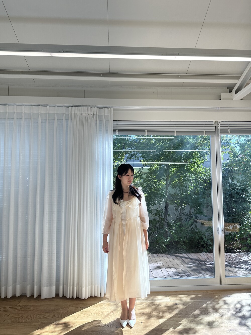 모델 착용 s 사이즈 - 원피스 속에 민소매 니트, 롱스커트 착용