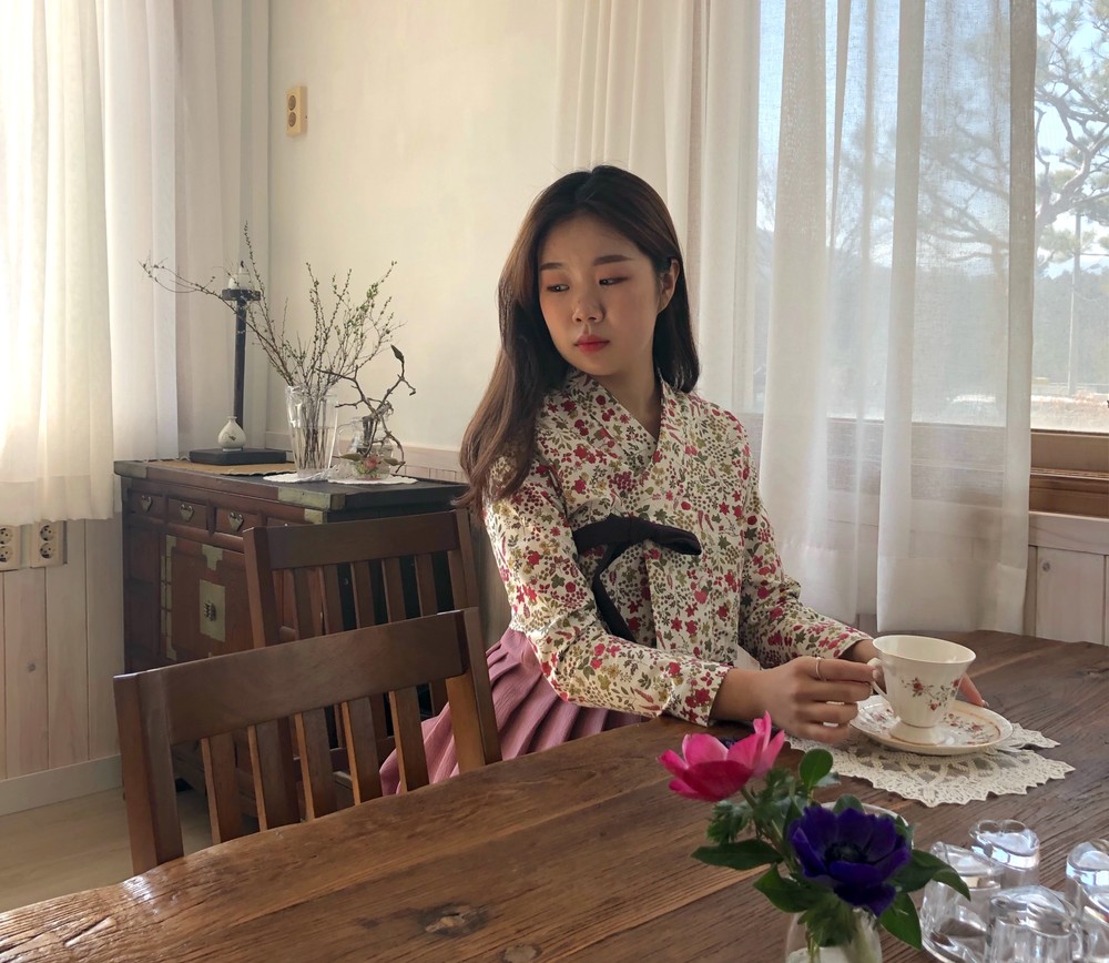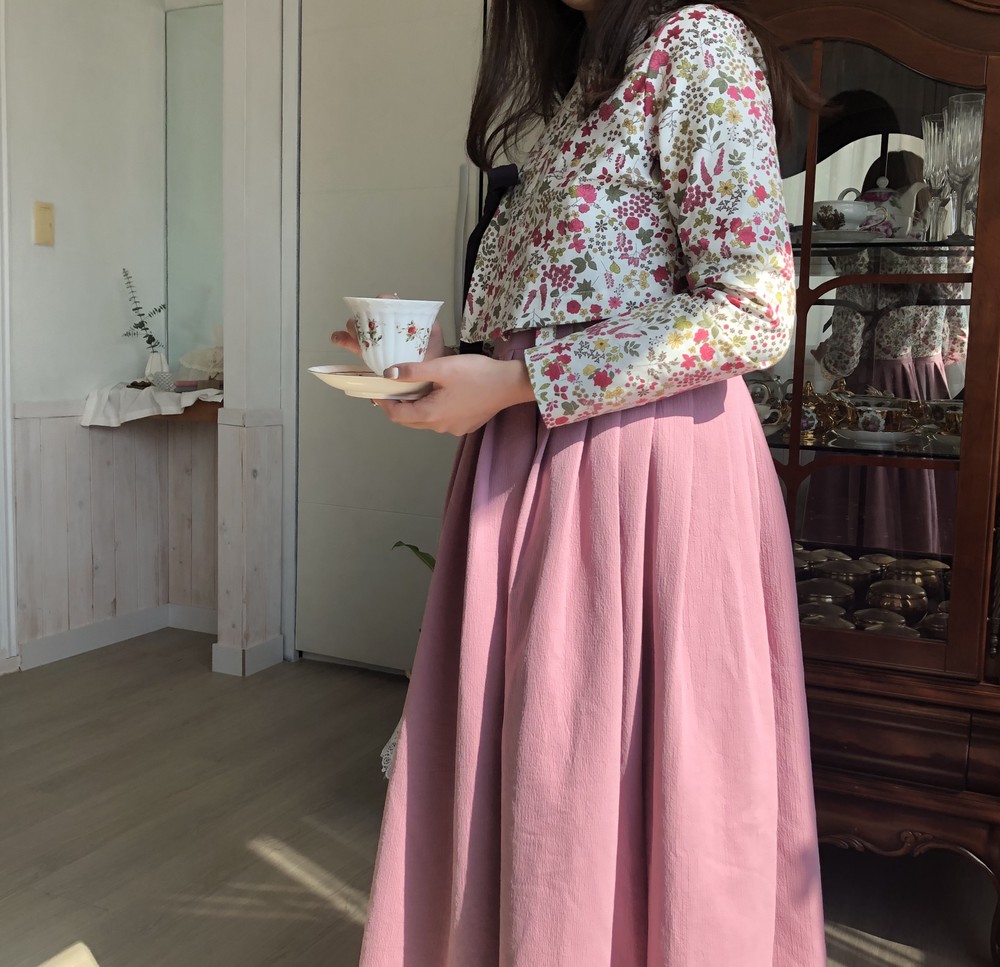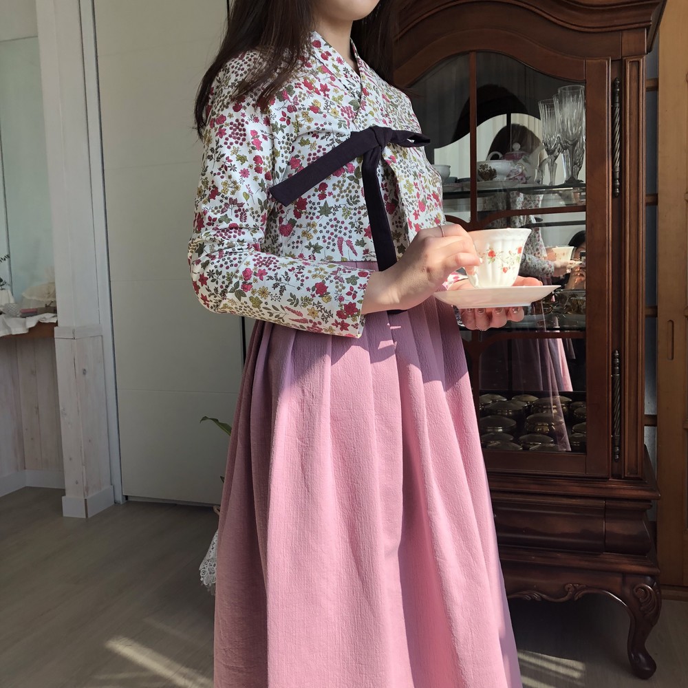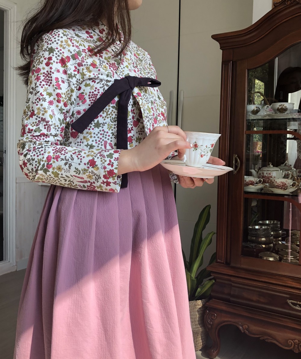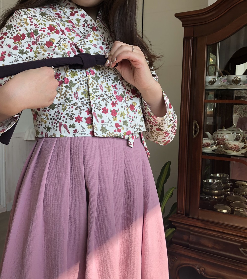 흰 바탕에 꽉 차있는 자주색 꽃과 ,올리브색의 잎들의 향연이 아름다운 원단의 저고리입니다.